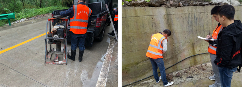 2、路面工程:路面厚度采用鉆孔取芯機(jī)取樣鋼直尺量測(cè),平整度用三米直尺按車道連續(xù)檢測(cè)。