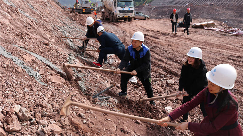 在活動現場,工程部部長劉太亮給大家介紹了雨名快速通道項目建設情況,高邊坡支護班組相關負責人現場指導高邊坡支護防護工作。全體黨員、入黨積極分子和公司其他員工在工程管理人員指導下,揮鎬舞鋤,積極參與勞動體驗。