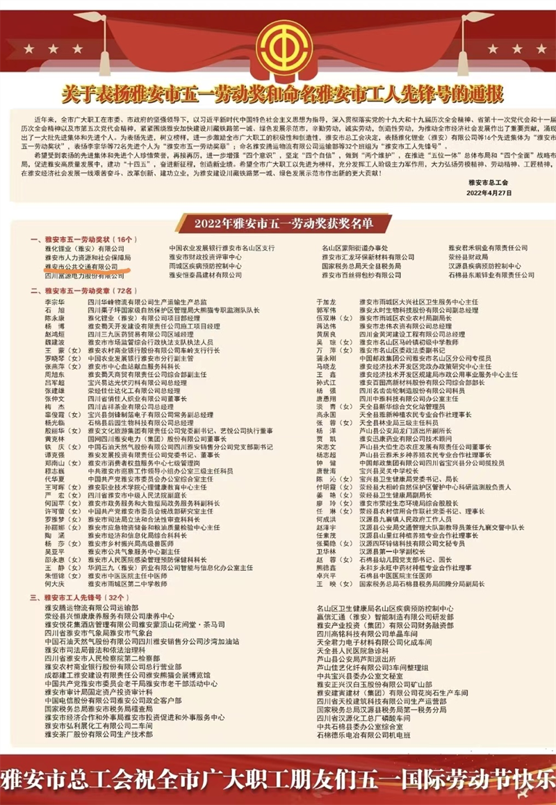 此次大會(huì)表彰雅安市五一勞動(dòng)獎(jiǎng)狀16個(gè)、雅安市五一勞動(dòng)獎(jiǎng)?wù)?2名、雅安市工人先鋒號(hào)32個(gè),雅安市公共交通有限公司獲得“雅安市五一勞動(dòng)獎(jiǎng)狀”榮譽(yù)稱號(hào)。