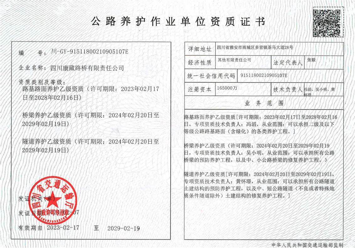 雅安市交通建設(shè)(集團(tuán))有限責(zé)任公司新增 橋梁養(yǎng)護(hù)乙級(jí)、隧道養(yǎng)護(hù)乙級(jí)兩項(xiàng)資質(zhì)
