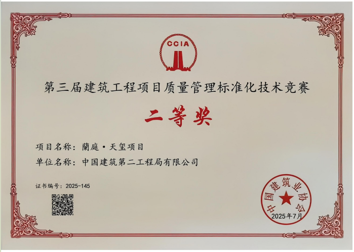 近日,交建開發(fā)公司旗下“蘭庭・天璽”項目在中國建筑業(yè)協(xié)會組織的“第三屆建筑工程項目質量管理標準化技術競賽”中榮獲二等獎。此次獲獎,標志著“蘭庭・天璽”項目的質量管理體系與工程實體質量獲得了行業(yè)權威認可,為項目后續(xù)創(chuàng)建更高層次的品質獎項積累了寶貴經(jīng)驗。
