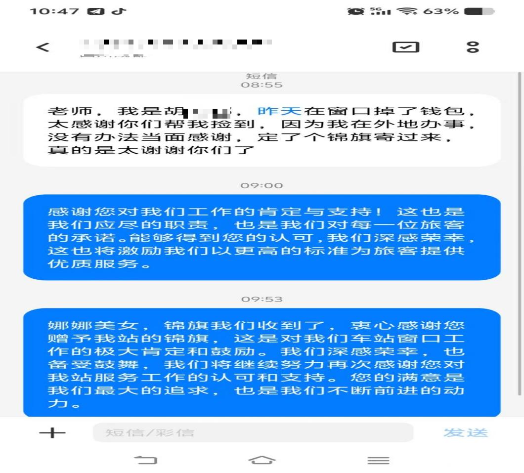 5月14日11時11分,售票員郝凌云發(fā)現(xiàn)柜臺上遺留了一個卡包,內(nèi)有現(xiàn)金 300 元、多張銀行卡、身份證及社?ǖ戎匾锲贰:铝柙频谝粫r間上報值班科長,通過站務(wù)系統(tǒng)比對購票信息,僅用5分鐘便鎖定失主為即將前往漢源的旅客胡女士,此時胡女士正在等待檢票,尚未察覺錢包丟失。值班站長通過廣播系統(tǒng)緊急尋人,胡女士聽到廣播后立即前往值班室認(rèn)領(lǐng)物品,經(jīng)值班科長仔細(xì)核對身份及物品信息后,將卡包完好歸還。胡女士激動致謝:“太感謝你了!你們汽車站的工作人員素質(zhì)真高,太讓人暖心了!”