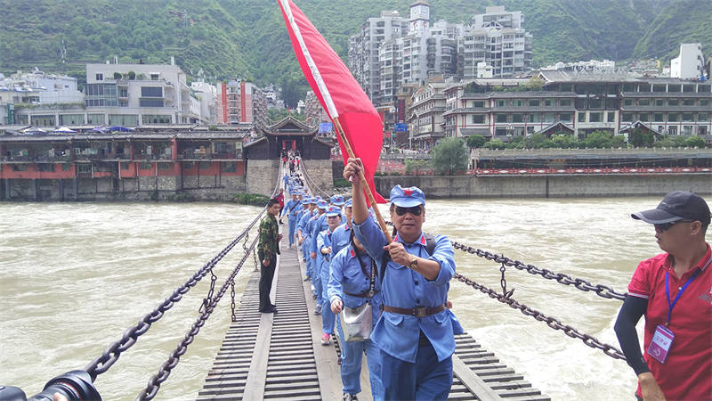 活動中,全體黨員干部職工換上紅軍服、戴上紅軍帽,走上瀘定橋,觸摸著沾染了無數(shù)革命烈士鮮血的鐵索,瞬間將大家的思緒拉回到1935年的5月29日,22名勇士冒著敵人的槍林彈雨,攀著鐵鏈沖向對岸,英勇奪下瀘定橋,取得長征中的一次決定性勝利場景。大家無不被革命先輩的英勇與無畏所震撼。