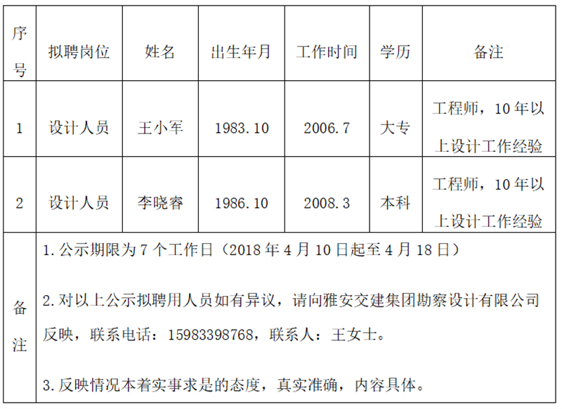 通過公開報(bào)名、資格審查、面試等程序,經(jīng)雅安交建集團(tuán)勘察設(shè)計(jì)有限公司研究擇優(yōu)確定以下2名擬聘用人員,現(xiàn)公示名單如下: