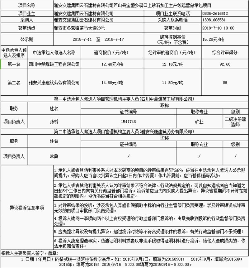 雅安交建集團(tuán)云石建材有限公司蘆山縣寶盛鄉(xiāng)溪口上砂石加工生產(chǎn)線運營總承包項目中選承包人公示