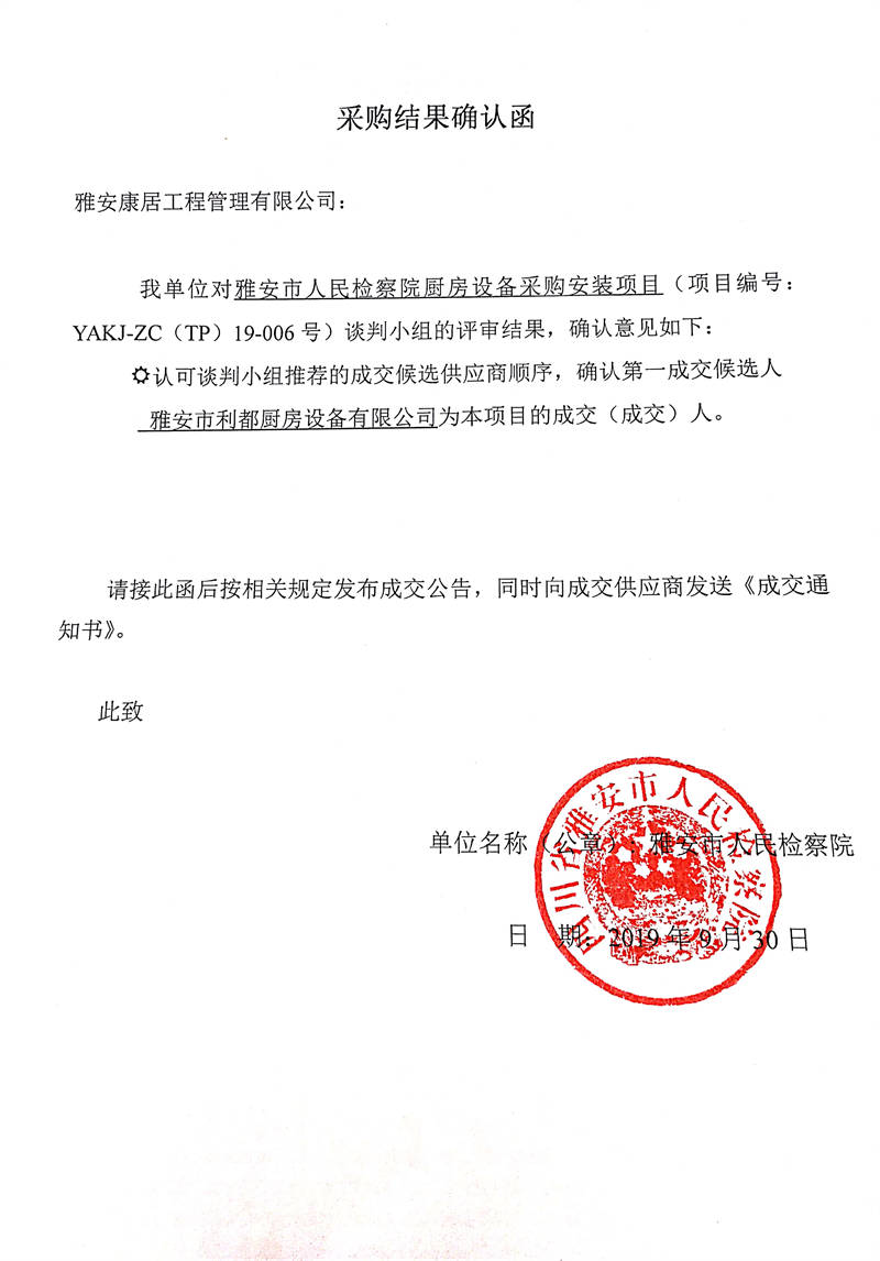 雅安市人民檢察院廚房設(shè)備采購安裝項(xiàng)目采購結(jié)果公示