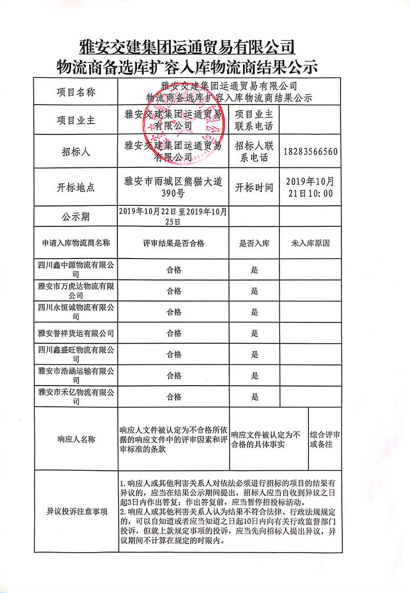 雅安交建集團運通貿(mào)易有限公司物流商備選庫擴容入庫物流商結(jié)果公示