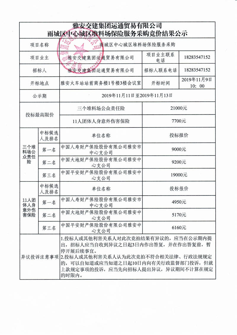 雅安交建集團運通貿易有限公司雨城區(qū)中心城區(qū)堆料場保險服務采購競價結果公示