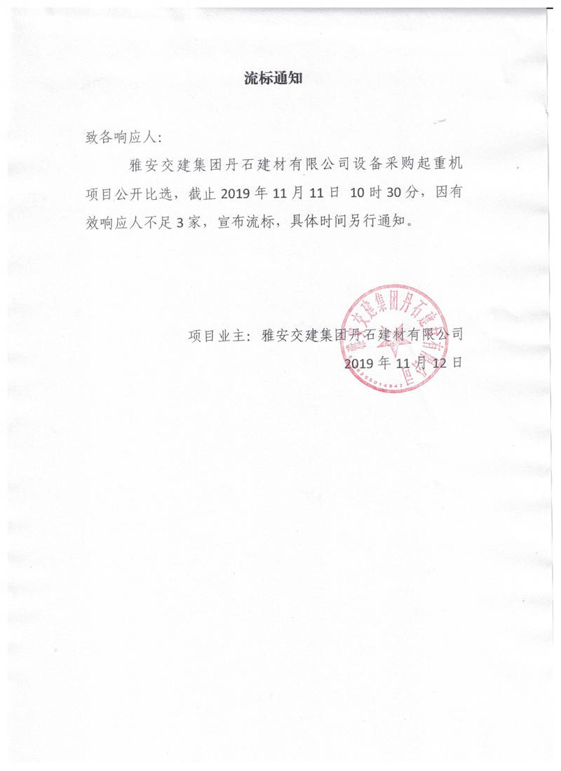 雅安交建集團(tuán)丹石建材有限公司設(shè)備采購(gòu)起重機(jī)項(xiàng)目流標(biāo)通知