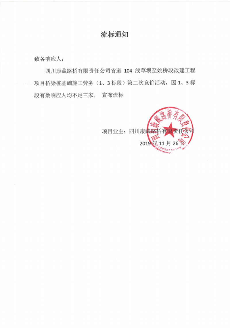 四川康藏路橋有限責任公司省道104線草壩至姚橋段改建工程項目橋梁樁基礎(chǔ)(1、3標段)施工勞務(wù)競價(第二次)流標通知