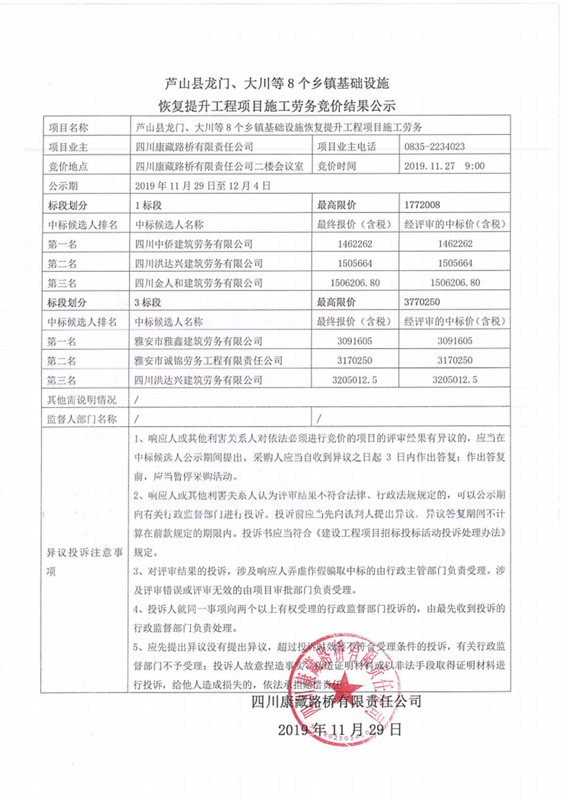 四川康藏路橋有限責(zé)任公司蘆山縣龍門、大川等8個鄉(xiāng)鎮(zhèn)基礎(chǔ)設(shè)施恢復(fù)提升工程項(xiàng)目施工勞務(wù)競價結(jié)果公示