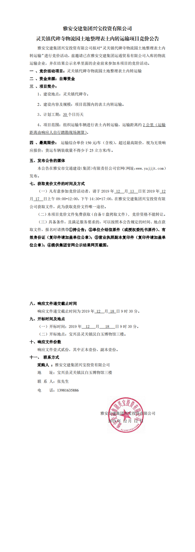 雅安交建集團(tuán)興寶投資有限公司靈關(guān)鎮(zhèn)代碑寺物流園土地整理表土內(nèi)轉(zhuǎn)運(yùn)輸項(xiàng)目競(jìng)價(jià)公告