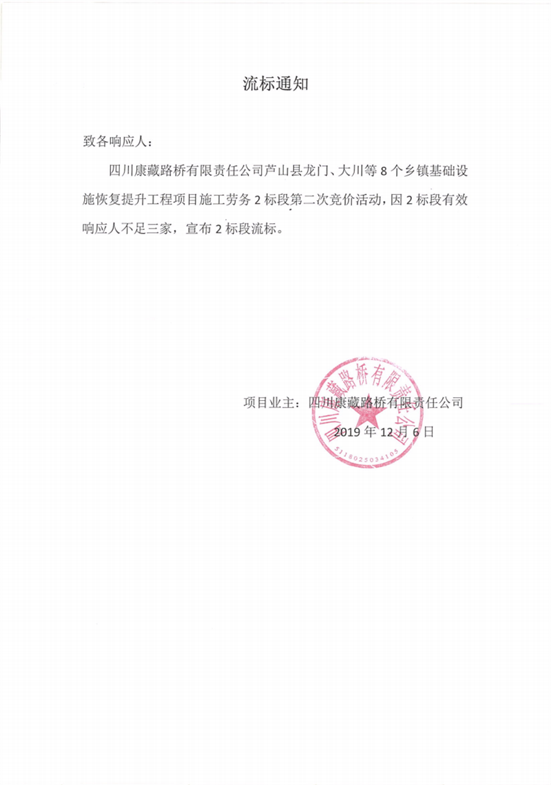 四川康藏路橋有限責(zé)任公司蘆山縣龍門、大川等8個(gè)鄉(xiāng)鎮(zhèn)基礎(chǔ)設(shè)施恢復(fù)提升工程項(xiàng)目施工勞務(wù)2標(biāo)段第二次競(jìng)價(jià)流標(biāo)通知
