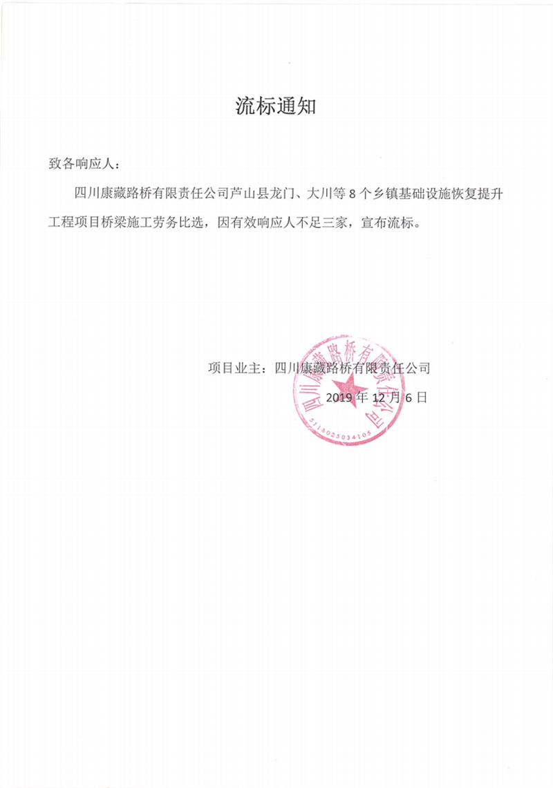 四川康藏路橋有限責任公司蘆山縣龍門、大川等8個鄉(xiāng)鎮(zhèn)基礎(chǔ)設(shè)施恢復提升工程項目橋梁施工勞務(wù)比選流標通知