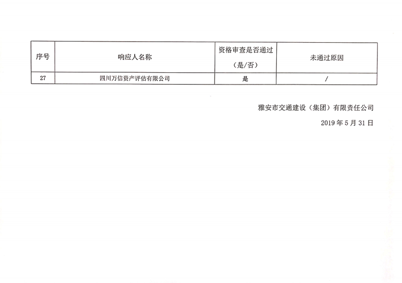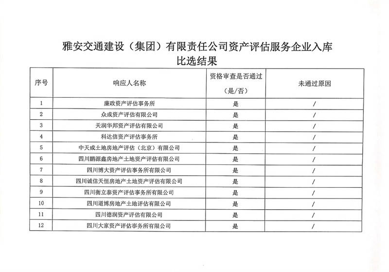雅安交通建設(shè)(集團(tuán))有限責(zé)任公司資產(chǎn)評(píng)估服務(wù)企業(yè)入庫比選結(jié)果