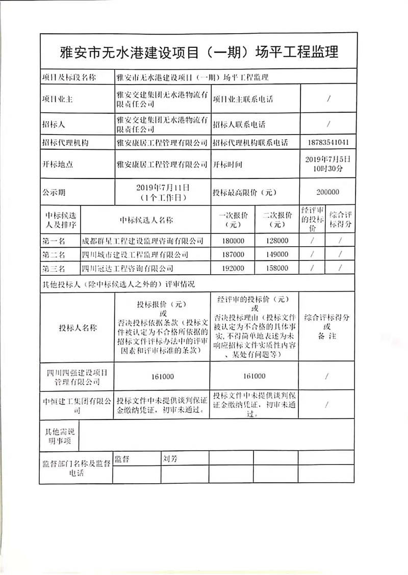 雅安交建集團無水港物流有限責(zé)任公司雅安市無水港建設(shè)項目(一期)場平工程監(jiān)理競爭性談判結(jié)果公示
