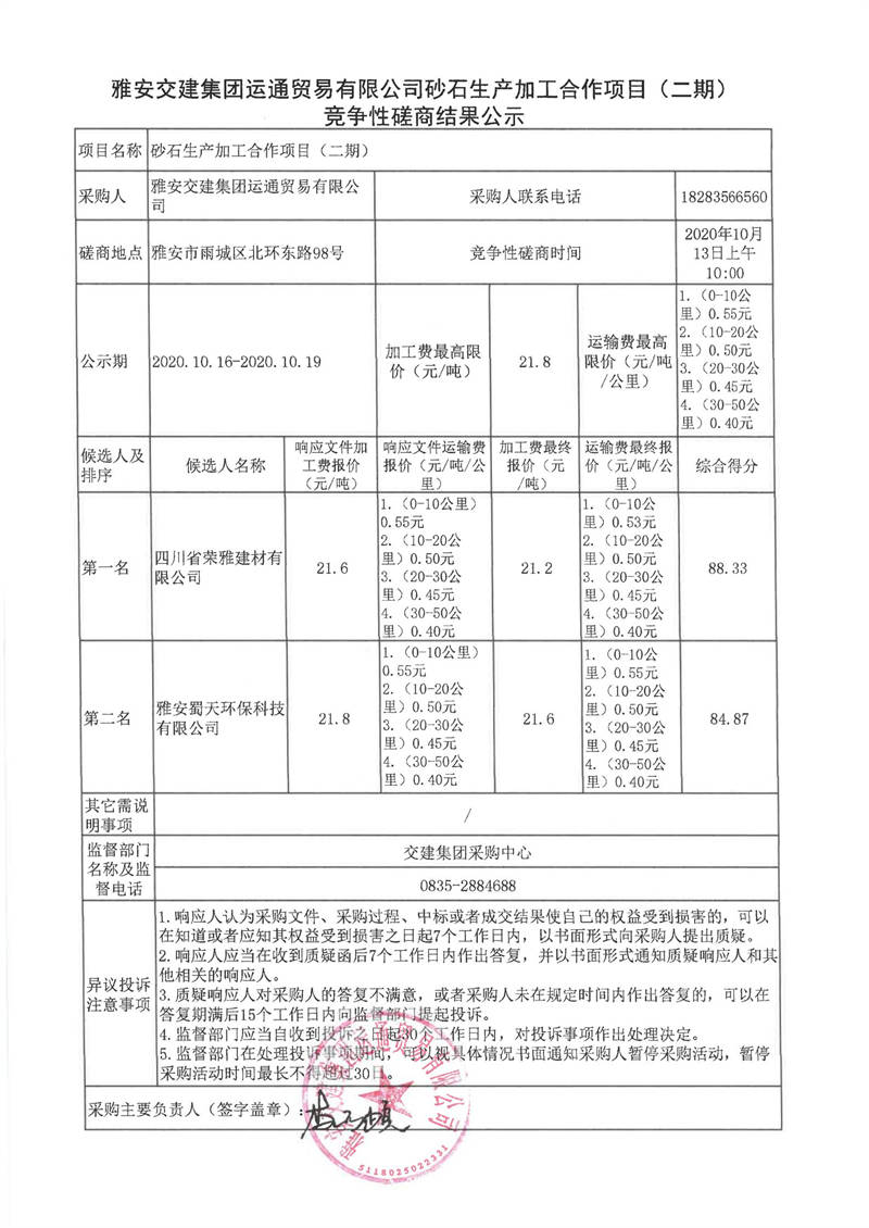 雅安交建集團(tuán)運(yùn)通貿(mào)易有限公司砂石生產(chǎn)加工合作項(xiàng)目(二期)競爭性磋商結(jié)果公示