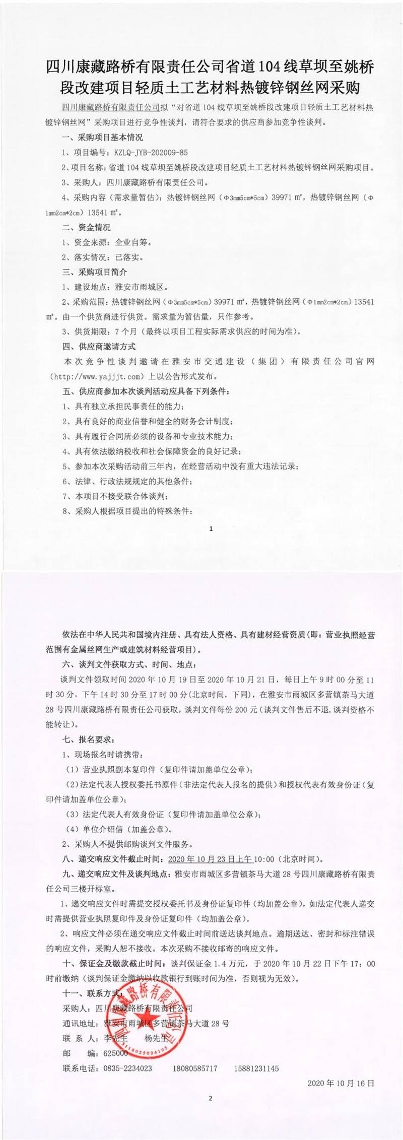 四川康藏路橋有限責任公司省道104線草壩至姚橋段改建項目輕質土工藝材料熱鍍鋅鋼絲網(wǎng)采購競爭性談判公告