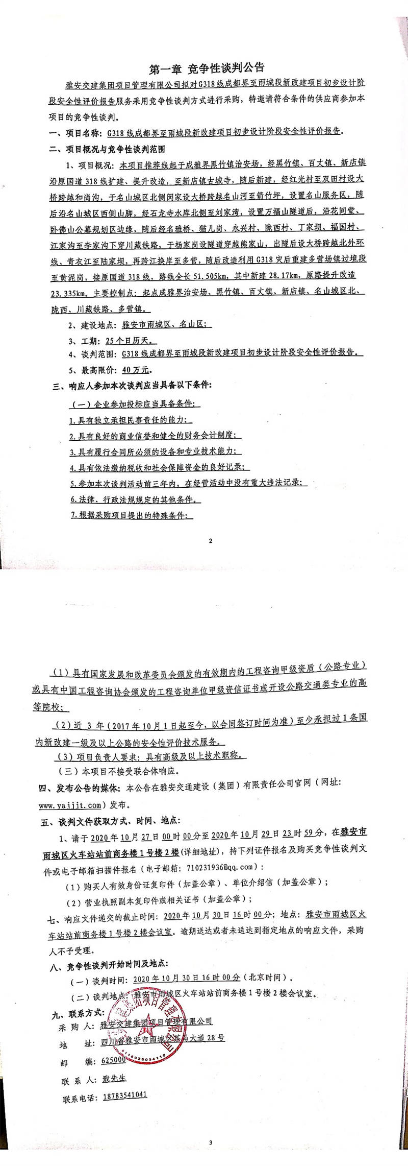 雅安交建集團(tuán)項(xiàng)目管理有限公司G318線成都界至雨城段新改建項(xiàng)目初步設(shè)計(jì)階段安全性評(píng)價(jià)報(bào)告競爭性談判公告