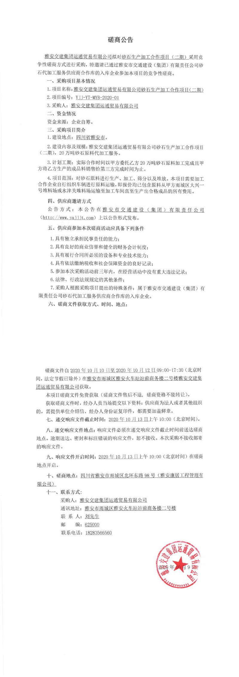 雅安交建集團運通貿(mào)易有限公司砂石生產(chǎn)加工合作項目(二期)競爭性磋商公告