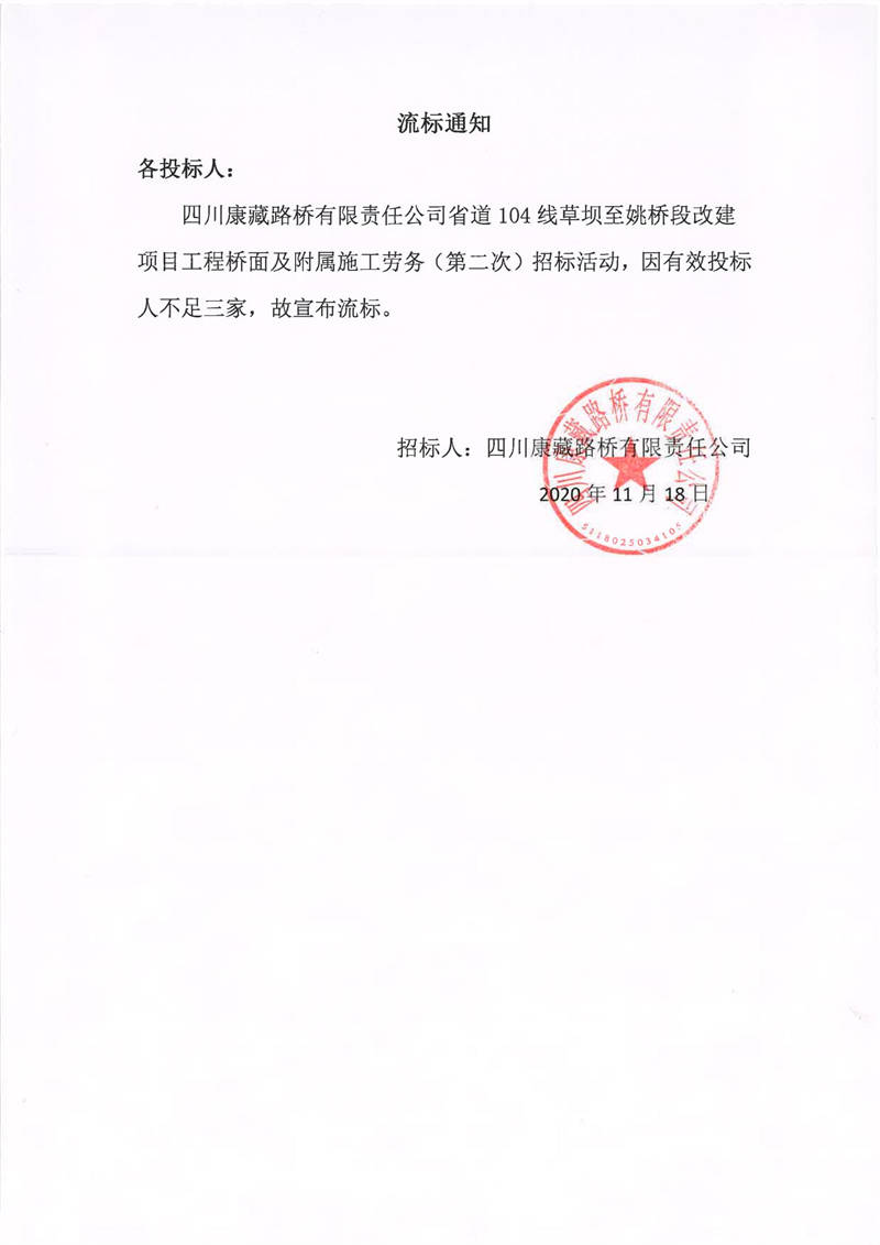 四川康藏路橋有限責任公司省道104線草壩至姚橋段改建項目工程橋面及附屬施工勞務(wù)(第二次)流標通知