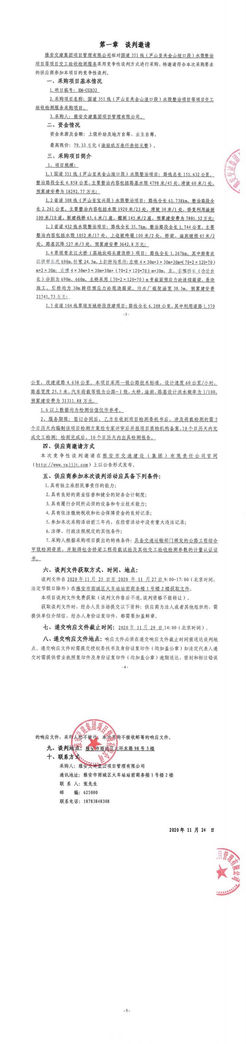 雅安交建集團(tuán)項(xiàng)目管理有限公司國道351線(蘆山至夾金山埡口段)水毀整治項(xiàng)目等項(xiàng)目交工驗(yàn)收檢測(cè)服務(wù)采購項(xiàng)目競(jìng)爭(zhēng)性談判公告