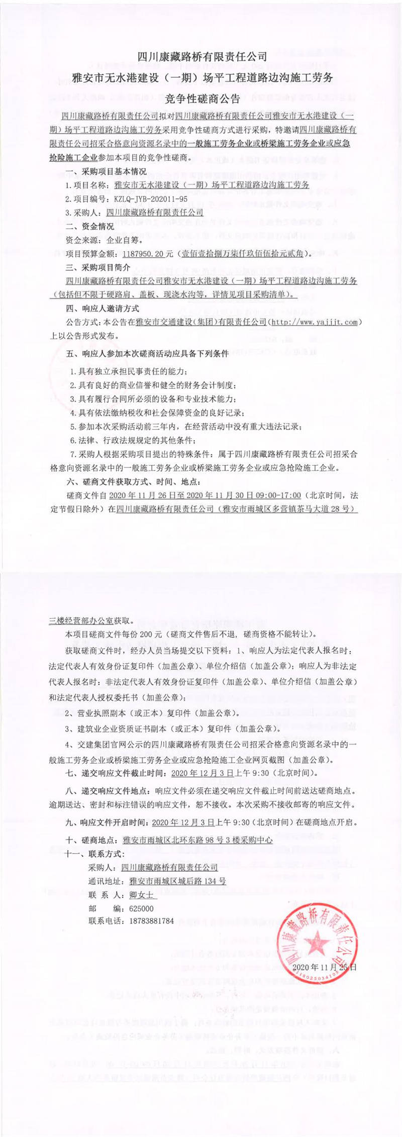 四川康藏路橋有限責(zé)任公司雅安市無水港建設(shè)(一期)場平工程道路邊溝施工勞務(wù)競爭性磋商公告