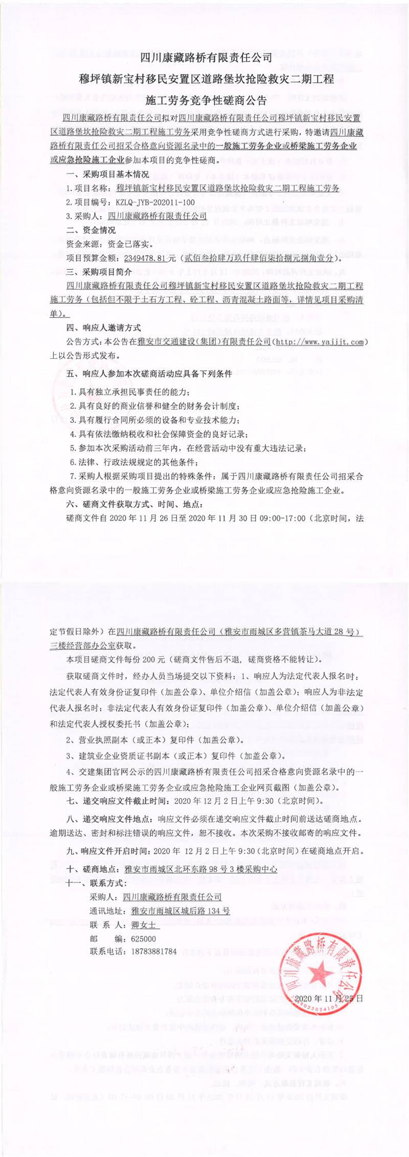 四川康藏路橋有限責(zé)任公司穆坪鎮(zhèn)新寶村移民安置區(qū)道路堡坎搶險救災(zāi)二期工程施工勞務(wù)競爭性磋商公告