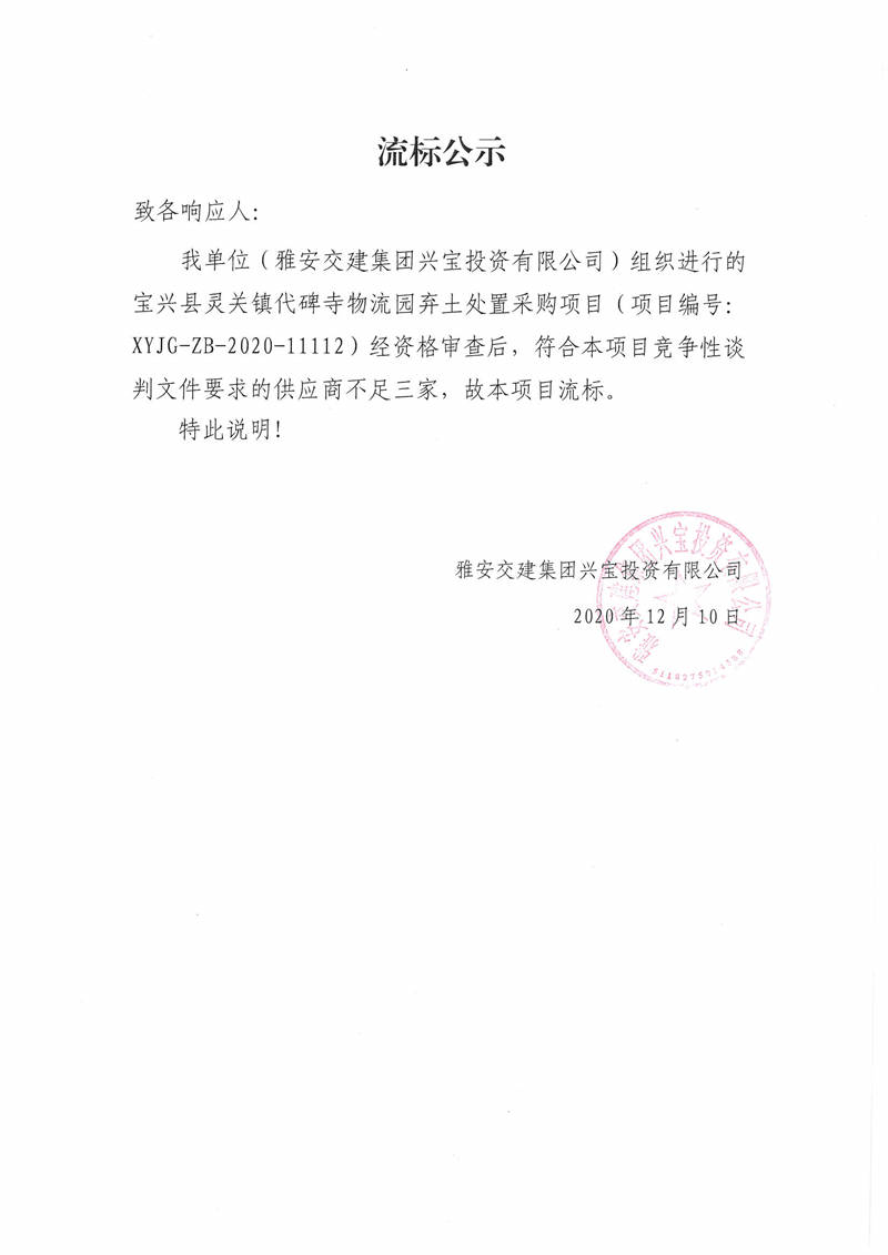 雅安交建集團(tuán)興寶投資有限公司寶興縣靈關(guān)鎮(zhèn)代碑寺物流園棄土處置采購項(xiàng)目流標(biāo)公示