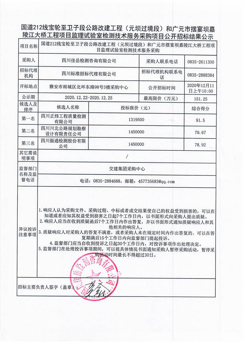 四川佳岳檢測(cè)咨詢有限公司國(guó)道212線寶輪至衛(wèi)子段公路改建工程(元壩過(guò)境段)和廣元市擺宴壩嘉陵江大橋工程項(xiàng)目監(jiān)理試驗(yàn)室檢測(cè)技術(shù)服務(wù)采購(gòu)項(xiàng)目公開招標(biāo)結(jié)果公示