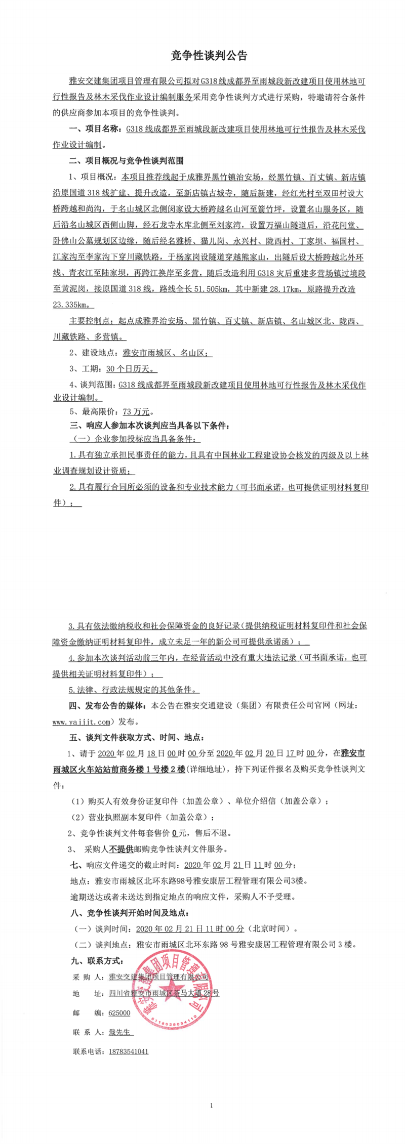 雅安交建集團項目管理有限公司G318線成都界至雨城段新改建項目使用林地可行性報告及林木采伐作業(yè)設(shè)計編制競爭性談判公告