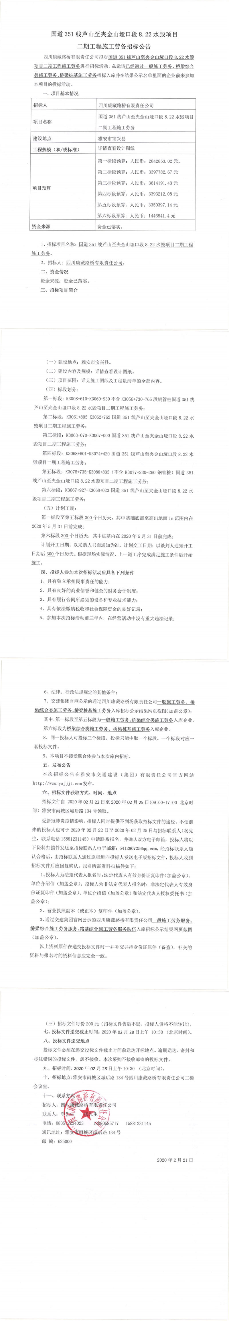 四川康藏路橋有限責(zé)任公司國道351線蘆山至夾金山埡口段8.22水毀項(xiàng)目二期工程施工勞務(wù)招標(biāo)公告