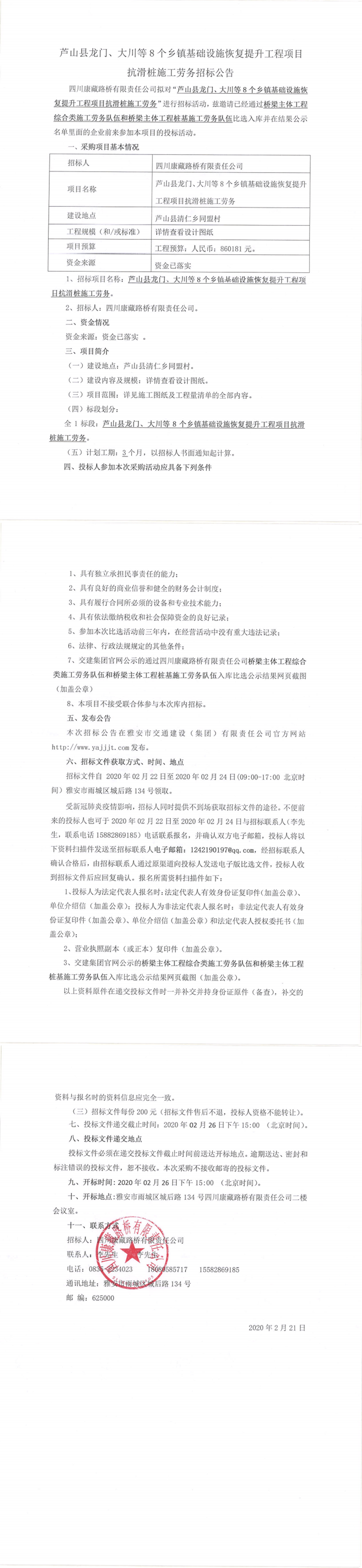 四川康藏路橋有限責(zé)任公司蘆山縣龍門、大川等8個(gè)鄉(xiāng)鎮(zhèn)基礎(chǔ)設(shè)施恢復(fù)提升工程項(xiàng)目抗滑樁施工勞務(wù)招標(biāo)公告