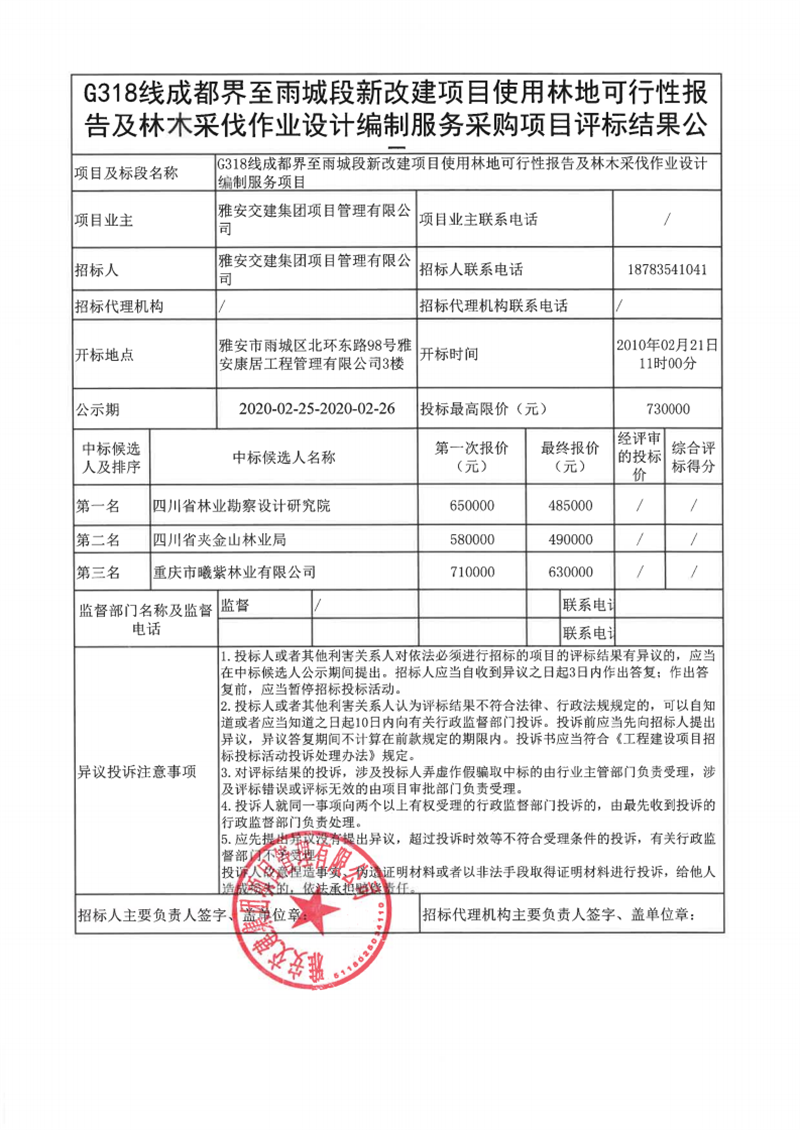 雅安交建集團(tuán)項目管理有限公司G318線成都界至雨城段新改建項目使用林地可行性報告及林木采伐作業(yè)設(shè)計編制服務(wù)采購項目評標(biāo)結(jié)果公示