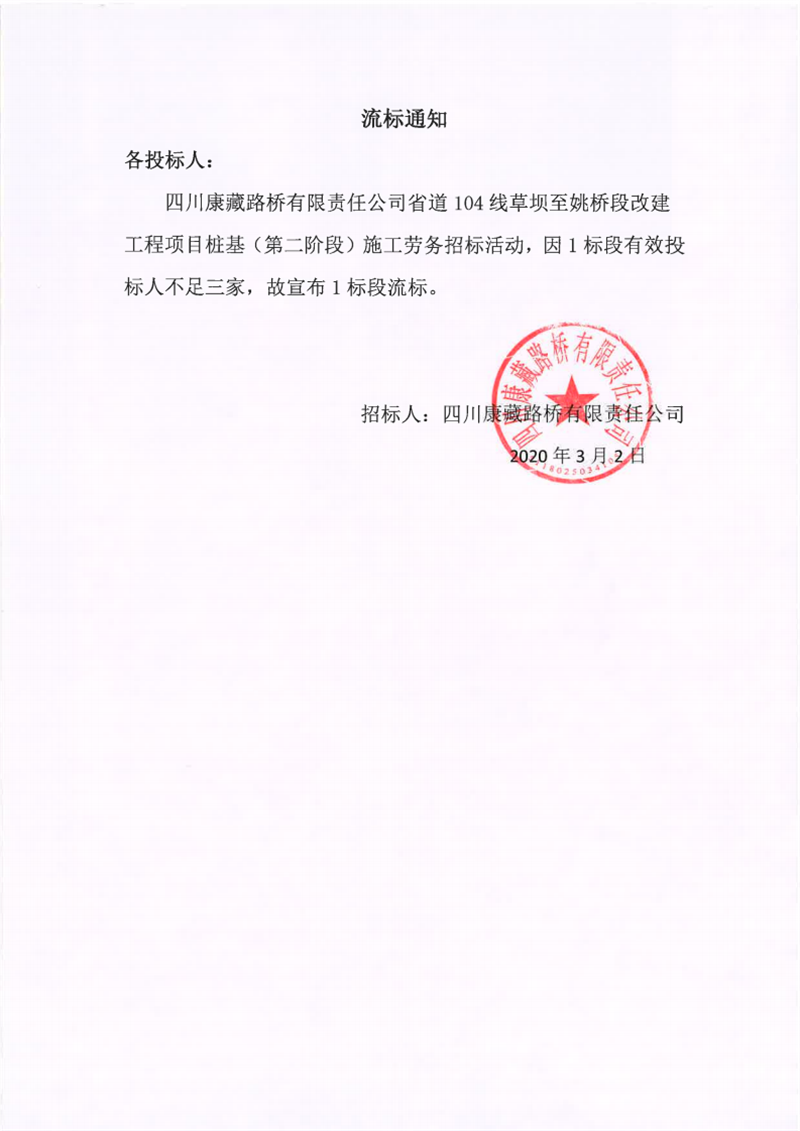 四川康藏路橋有限責任公司省道104線草壩至姚橋段改建工程項目樁基(第二階段)施工勞務(wù)流標通知