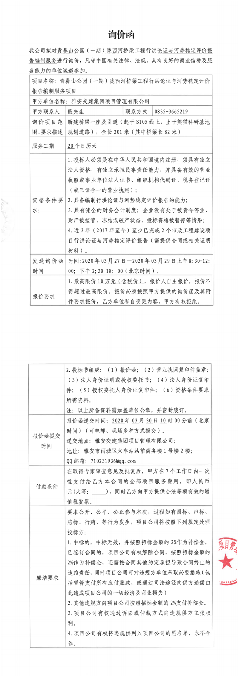雅安交建集團(tuán)項(xiàng)目管理有限公司青鼻山公園(一期)隴西河橋梁工程行洪論證及河勢穩(wěn)定評(píng)價(jià)報(bào)告編制服務(wù)項(xiàng)目詢價(jià)函