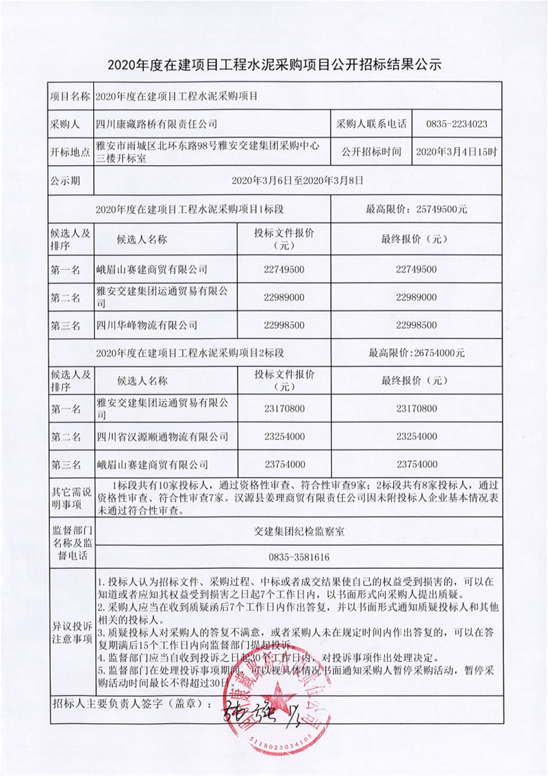 四川康藏路橋有限責(zé)任公司2020年度在建項(xiàng)目工程水泥采購(gòu)項(xiàng)目公開(kāi)招標(biāo)結(jié)果公示
