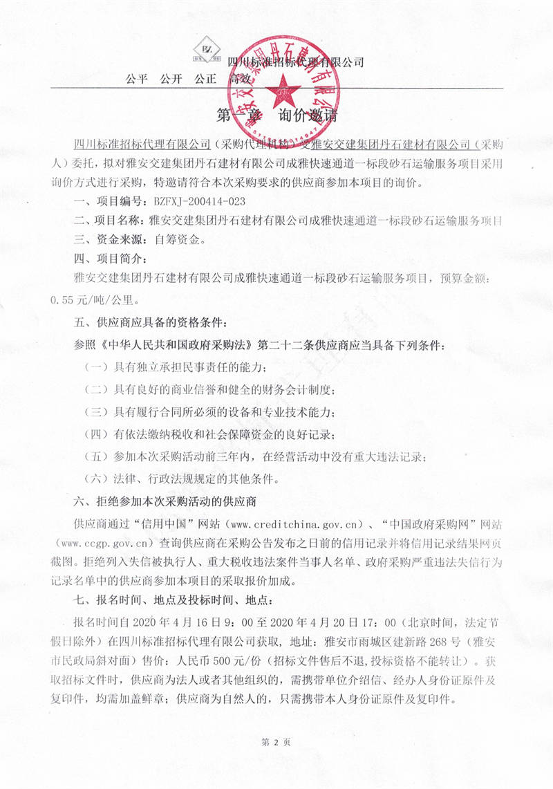 雅安交建集團丹石建材有限公司成雅快速通道一標段砂石運輸服務項目詢價公告
