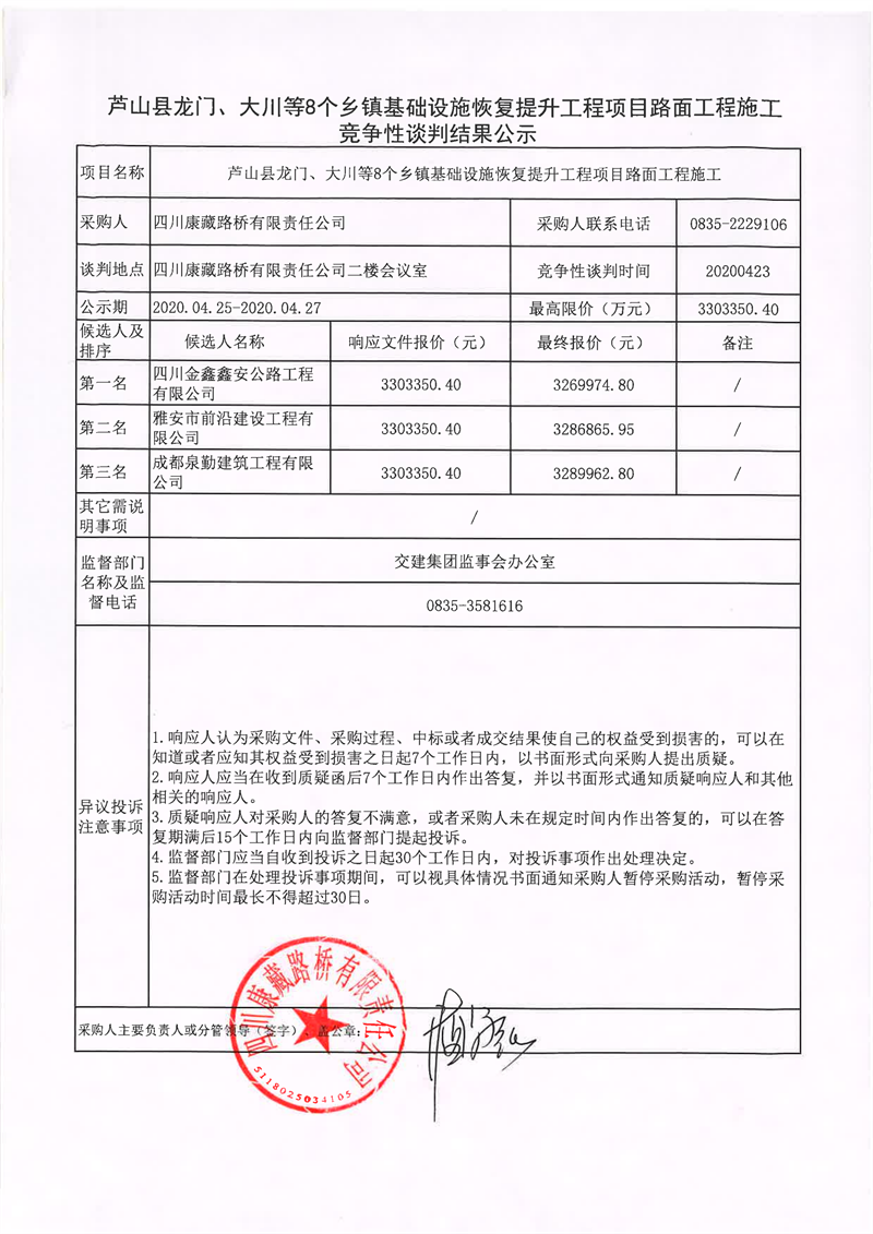四川康藏路橋有限責任公司蘆山縣龍門、大川等8個鄉(xiāng)鎮(zhèn)基礎(chǔ)設施恢復提升工程項目路面工程施工競爭性談判結(jié)果公示