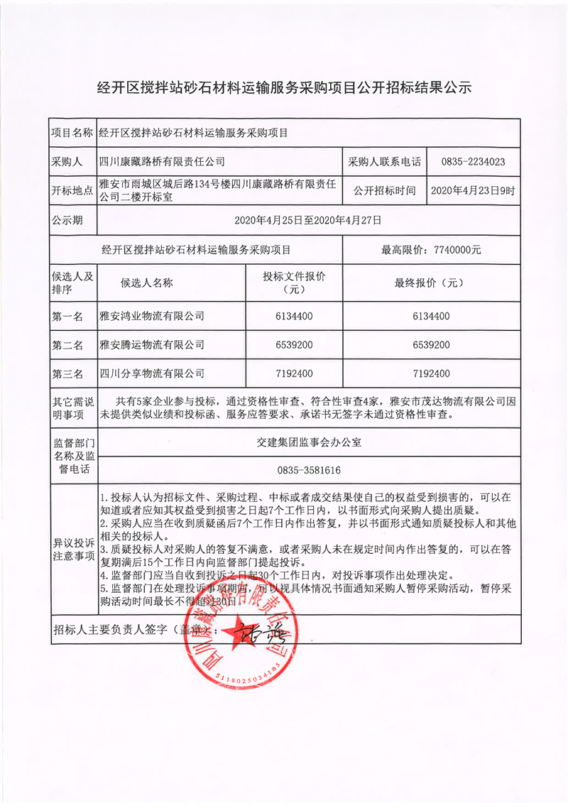 四川康藏路橋有限責(zé)任公司經(jīng)開區(qū)攪拌站砂石材料運輸服務(wù)采購項目公開招標(biāo)結(jié)果公示