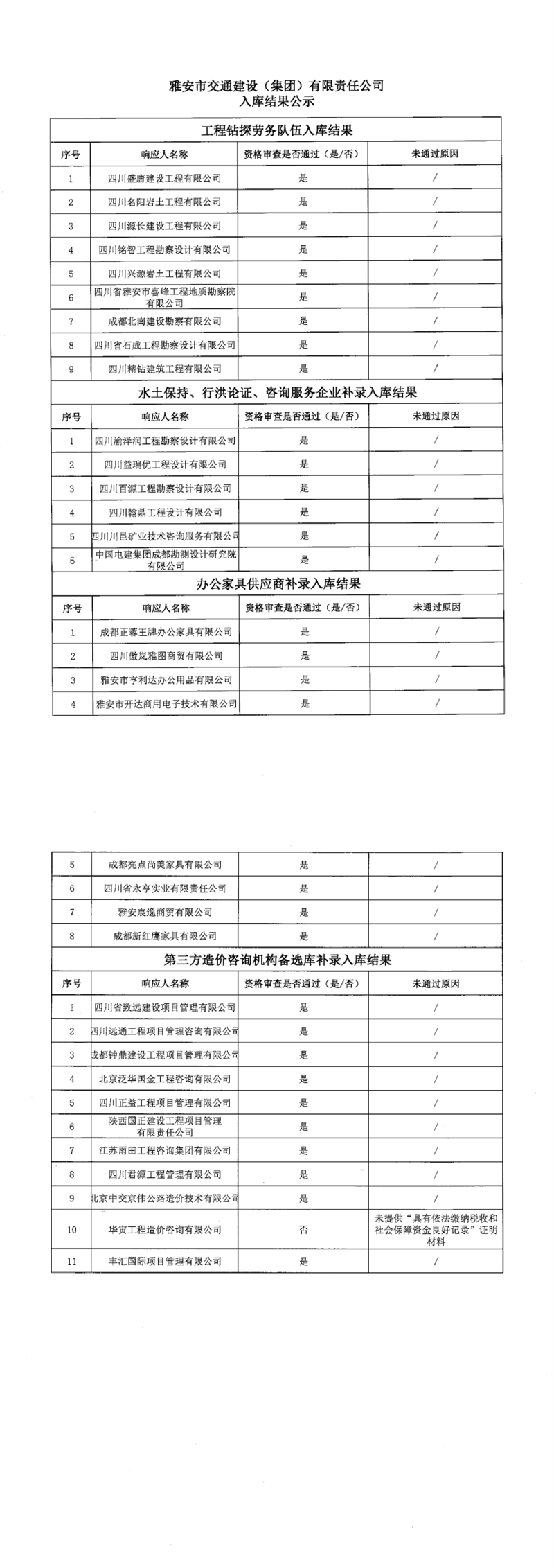 雅安市交通建設(shè)(集團(tuán))有限責(zé)任公司入庫結(jié)果公示