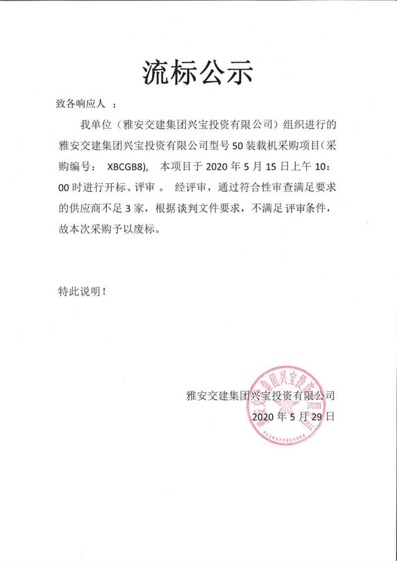 雅安交建集團(tuán)興寶投資有限公司型號(hào)50裝載機(jī)采購項(xiàng)目流標(biāo)公示