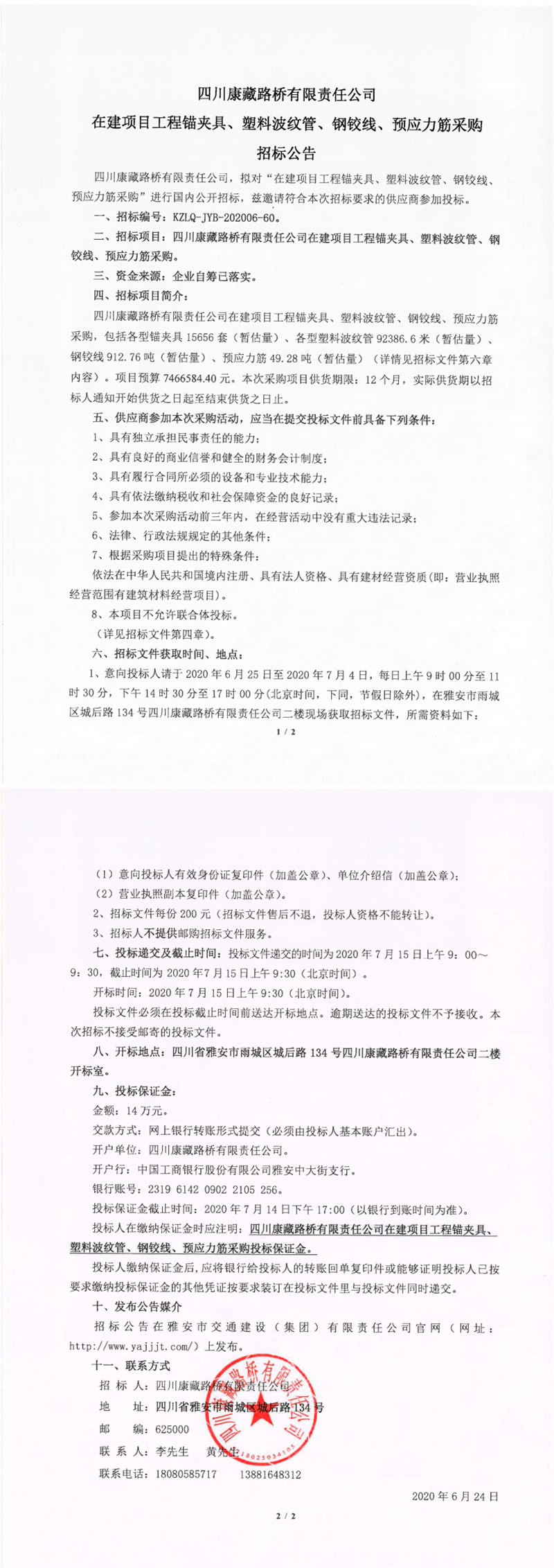 四川康藏路橋有限責任公司在建項目工程錨夾具、塑料波紋管、鋼鉸線、預應力筋采購招標公告