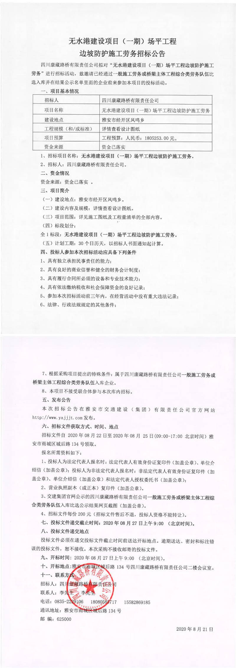 四川康藏路橋有限責任公司無水港建設項目(一期)場平工程邊坡防護施工勞務招標公告
