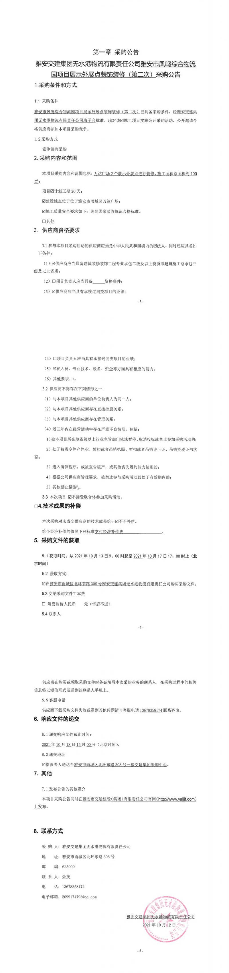 雅安交建集團(tuán)無(wú)水港物流有限責(zé)任公司雅安市鳳鳴綜合物流園項(xiàng)目售樓部裝飾裝修工程(第二次)采購(gòu)公告