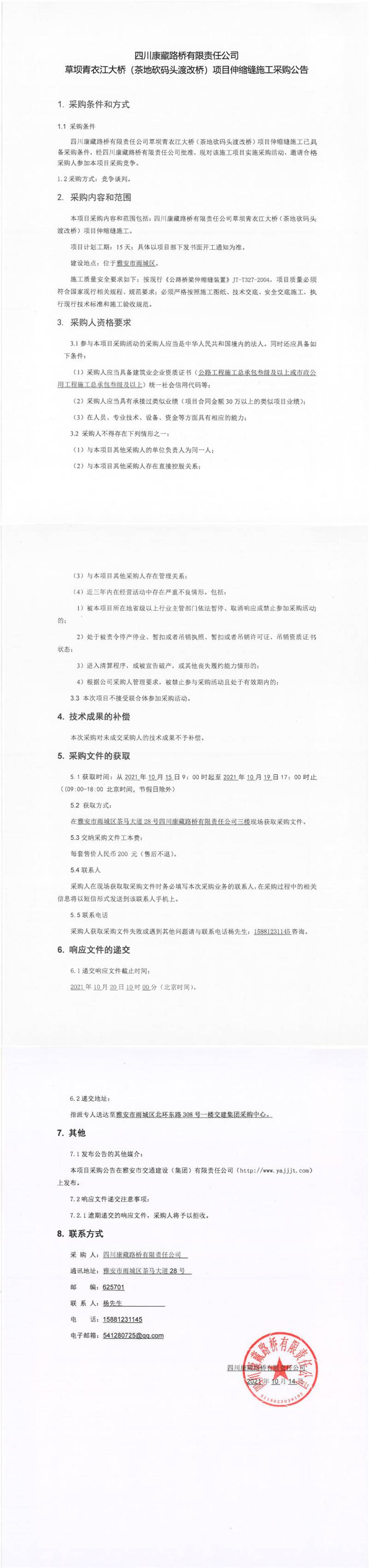 四川康藏路橋有限責(zé)任公司草壩青衣江大橋(茶地坎碼頭渡改橋)項(xiàng)目伸縮縫施工采購公告