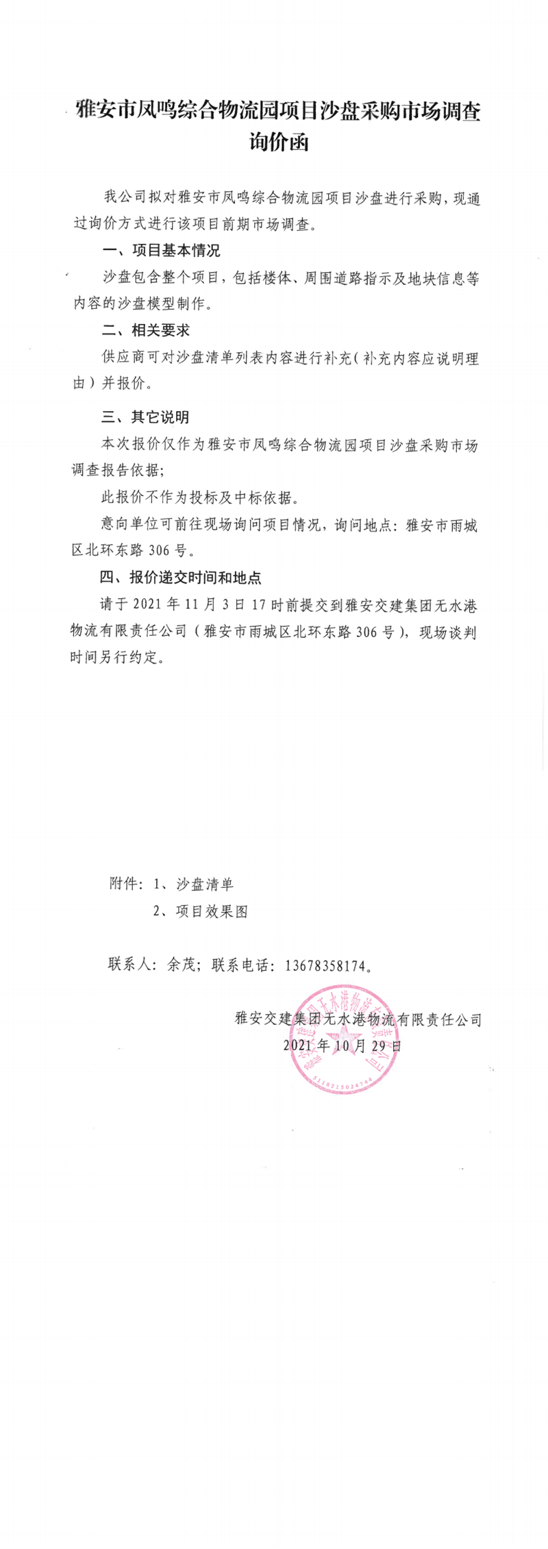 雅安交建集團(tuán)無水港物流有限責(zé)任公司雅安市鳳鳴綜合物流園項(xiàng)目沙盤采購(gòu)市場(chǎng)調(diào)查詢價(jià)函