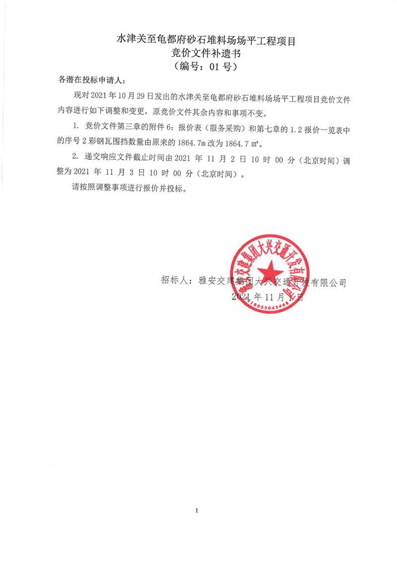 雅安交建集團(tuán)大興交通開發(fā)有限公司水津關(guān)至龜都府砂石堆料場場平工程項目競價文件補(bǔ)遺書(編號:01號)