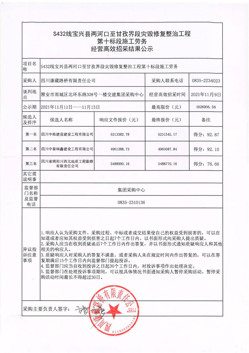 四川康藏路橋有限責(zé)任公司S432線(xiàn)寶興縣兩河口至甘孜界段災(zāi)毀修復(fù)整治工程第十標(biāo)段施工勞務(wù)經(jīng)營(yíng)高效招采結(jié)果公示