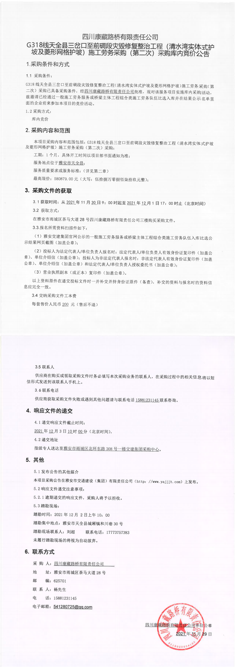 四川康藏路橋有限責任公司G318線天全縣三岔口至前碉段災毀修復整治工程(清水灣實體式護坡及菱形網(wǎng)護坡)施工勞務采購(第二次)采購庫內(nèi)競價公告